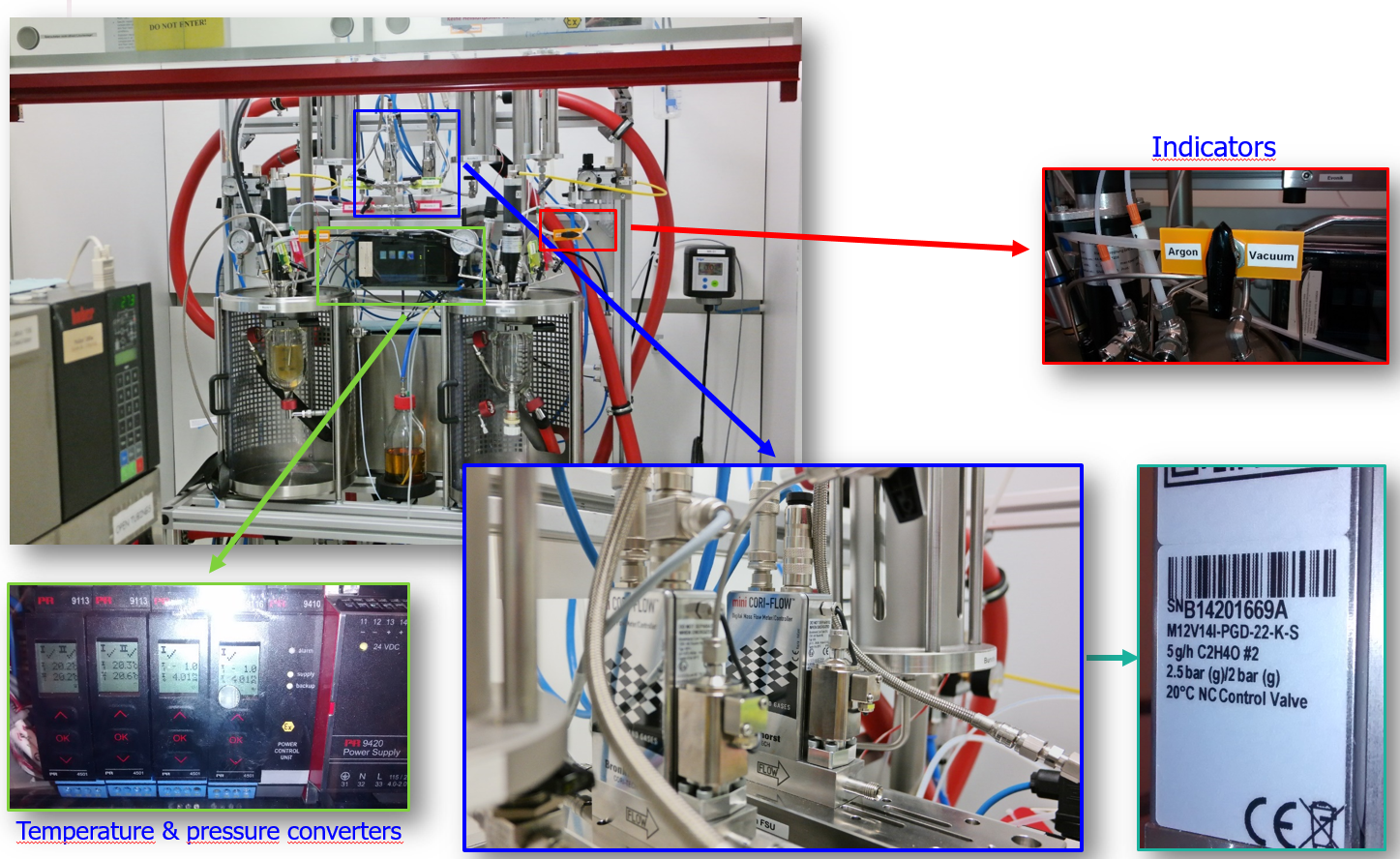 The polymerization of gaseous monomers is quite challenging and requires specialized equipment and additional safety infrastructure, in particular if very toxic and also explosive materials are used. In our case, the monomers, e.g. ethylene oxide (EO), are polymerized via the anionic ring opening polymerization (AROP). The used AROP is a controlled chain-growth polymerization, which is initiated via an active anionic species, e.g. the diphenylmethane potassium (DPMK). This polymerization requires very dry and clean starting materials as well as a closed reaction apparatus, and is therefore performed in two BüchiGlasUster (Uster, Switzerland) small scale PicoClave glass autoclaves (200 and 300 mL). The autoclaves are equipped with a cover made of stainless steel, fast action closure, pressure gauge, different valves, a rupture disc, and a polycarbonate shield for safety. These are pressure stable up to 6 and 10 bar, respectively, and fully ATEX certified. The two burettes connected to the autoclaves are both made of glass and stainless steel; a cylindrical glass tube with a heating/cooling jacket sitting inside a stainless steel frame, allowing pressures up to 12 bar. In addition, both autoclaves and burettes are equipped with PT100 temperature as well as pressure sensors. For automation, a Siemens Simatic S7-1200 is used and the two Bronkhorst mini CORI-FLOW devices allow to control the mass flow of the monomers with flow rates between 0.1 and 200 g h-1. For heating/cooling, a thermostat offers a working temperature range between –90 °C up to 200 °C. With this equipment, short reaction times and a very good control over the polymerization, including low dispersities (Đ), can be realized. In addition, the in-situ online-IR measurements can visualize the EO consumption directly and the kinetics of the polymerization could be calculated.
